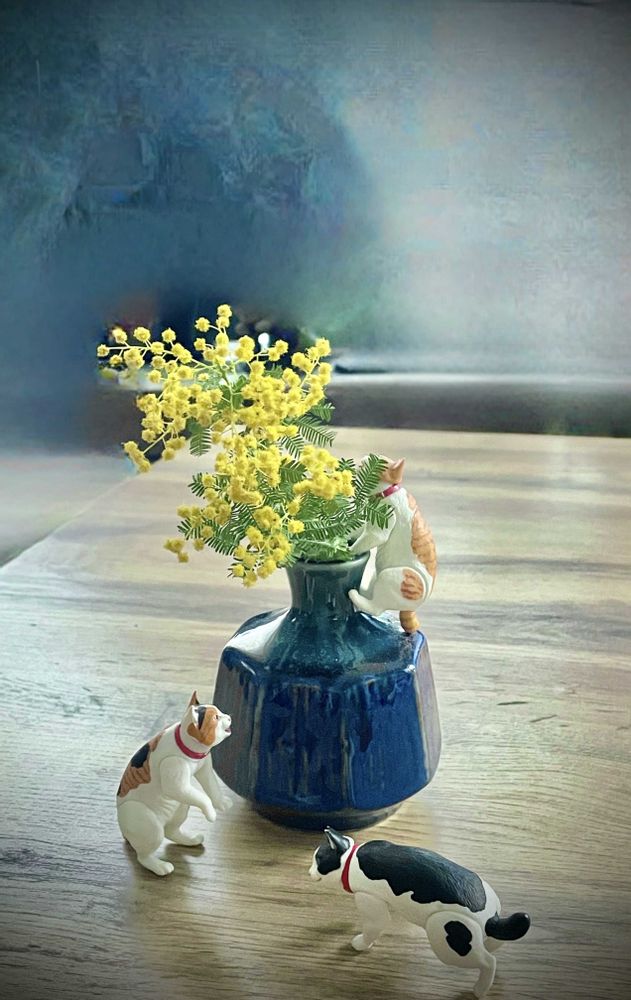 お家のあちこちにミモザを分けて飾ってるのかな?明るい黄色で一気に春気分が上がりますね。