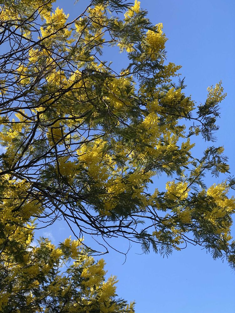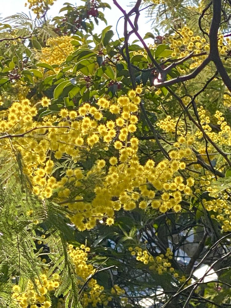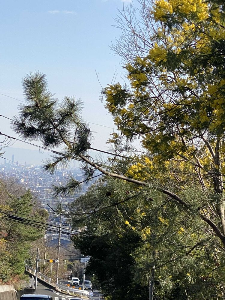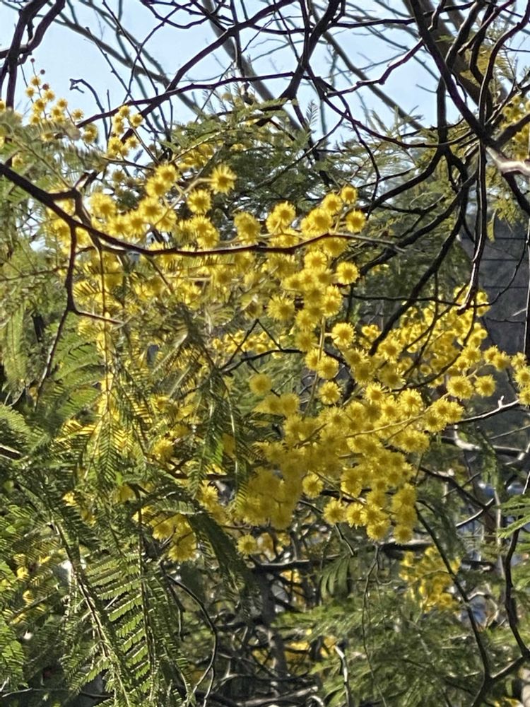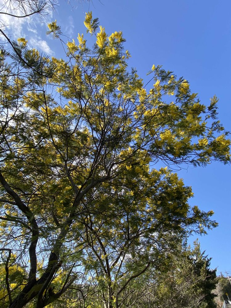 長い坂道脇でミモザアカシヤが咲いていました。青空に黄色の花🌼が綺麗でした。