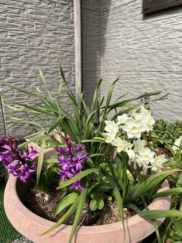 ヒヤシンスとスイセンの寄せ植えもいいですね💕