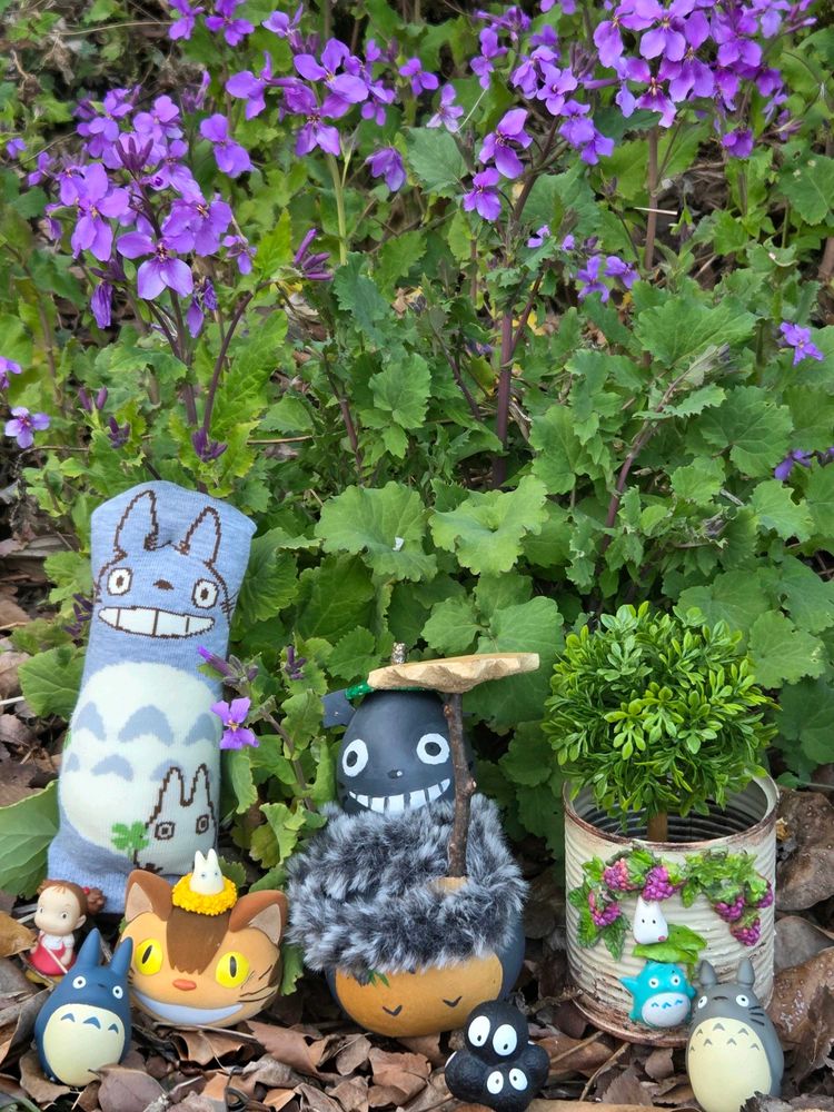 ※手作りひょうたんトトロチャンと手作りソクトトロチャンと45さんに頂いた🐈️チャンとkazukoさんのトトロ缶仲良くお花をバックに👀📷✨