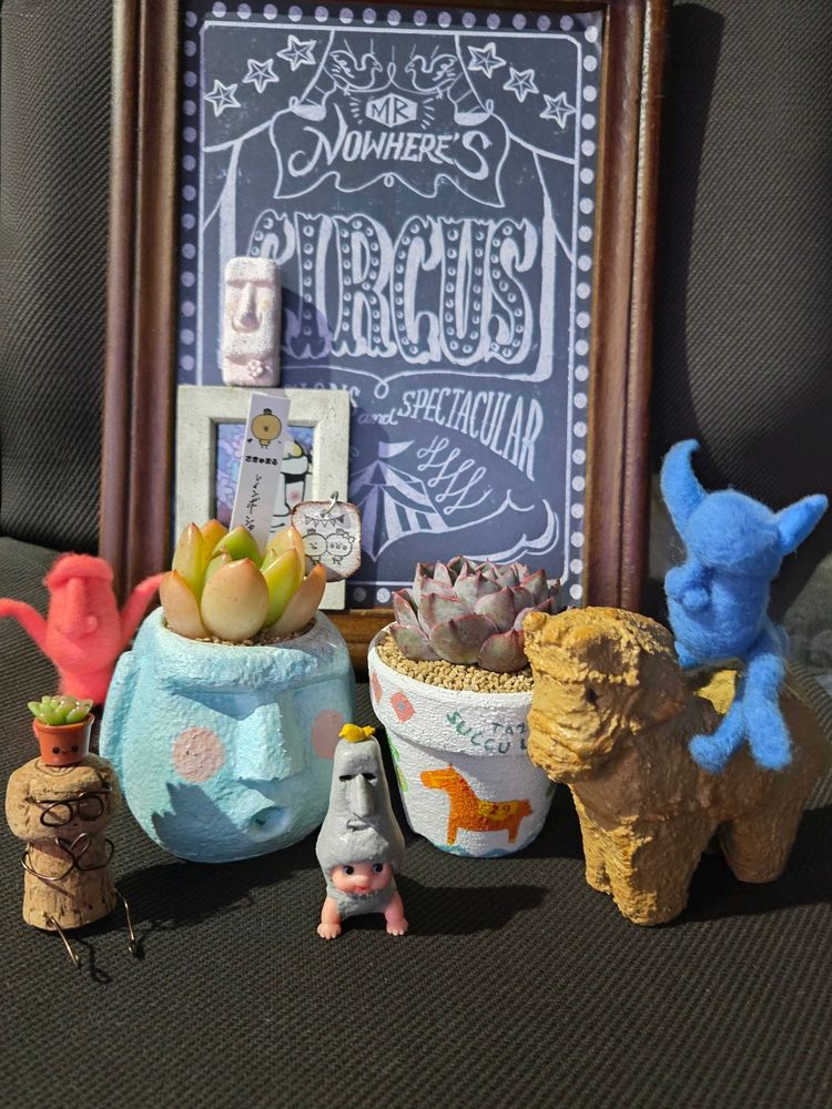 ハニワチャンとfukumomoさんのモアイ鉢...ピンクパンサーさんのモアイキュピチャン仲良くルンルン😃🎵