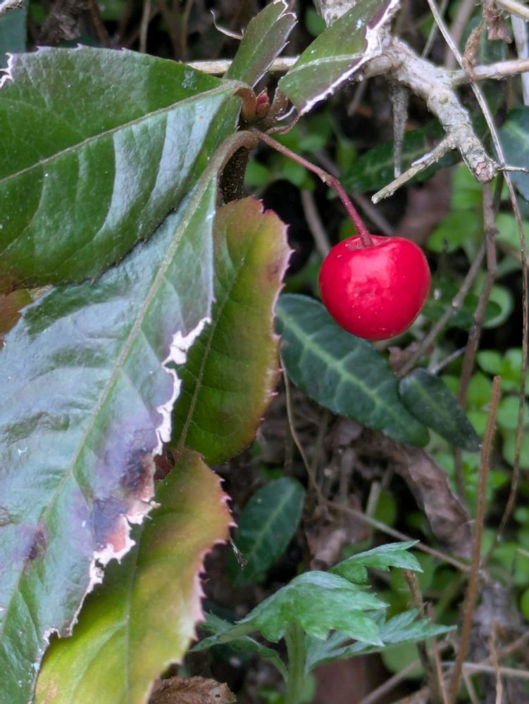 この可愛らしいヤブコウジの実の🔴奥の緑の🟢葉っぱはテイカカズラのような気がしますが、