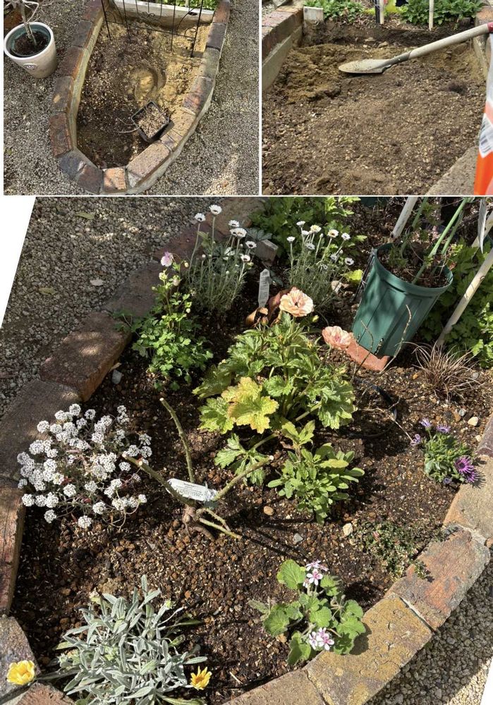 ←鉢植えの樹木を植えようか、半つるバラを植えようか、違う花壇とアーチで繋げようか、はたまたトンネルにしようか、いや狭いしな…バラ移植する??と悩んでいた頃。