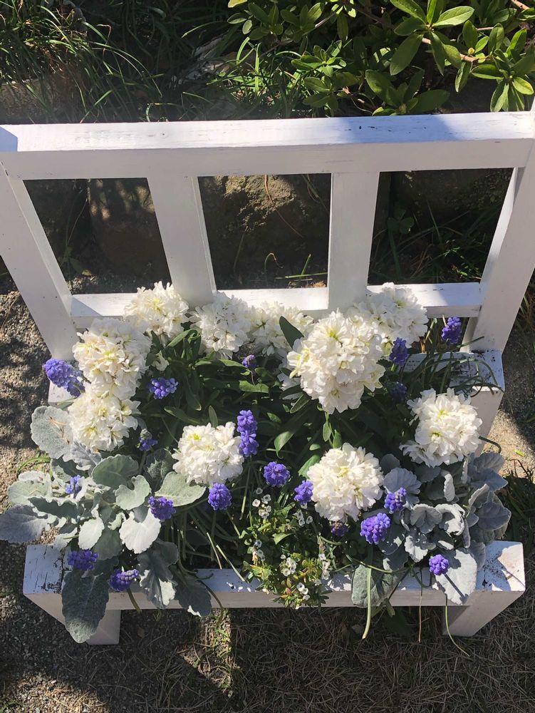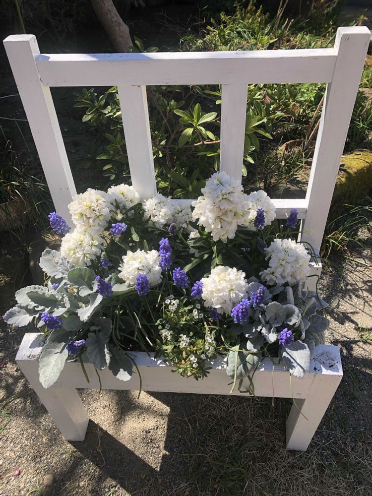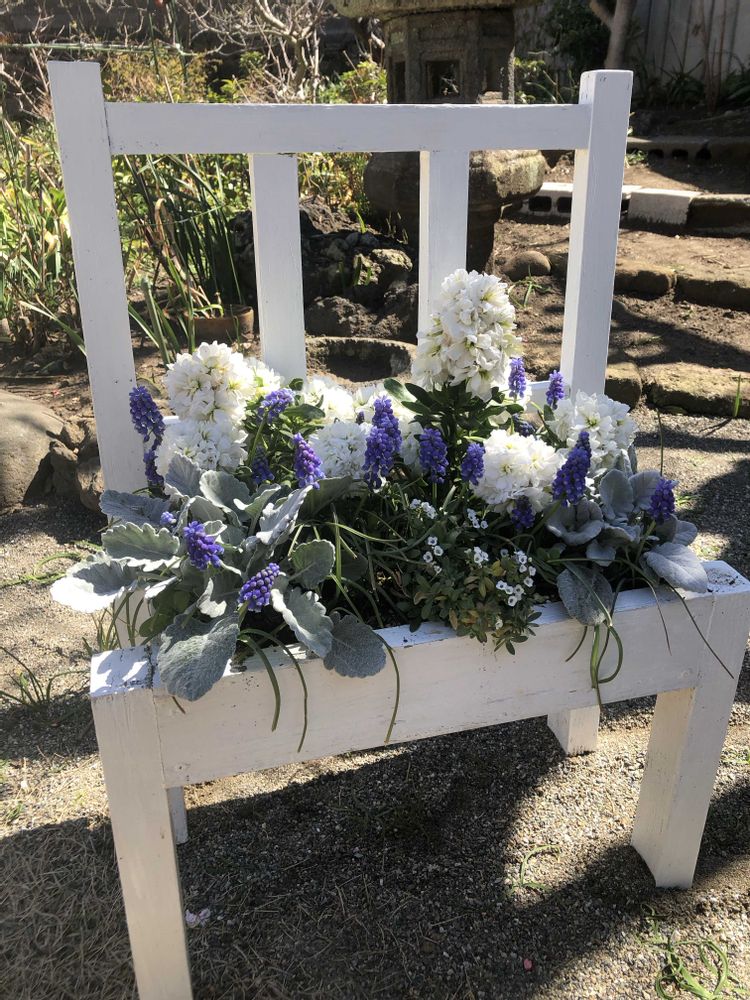 植え付けた時は、スカスカで寂しかったんだけど😢、ストックが大きくなって、ムスカリ💜も咲いたので、やっと良い感じになりました❣️