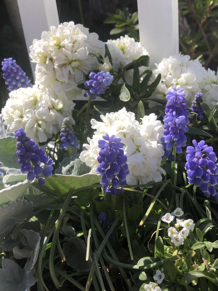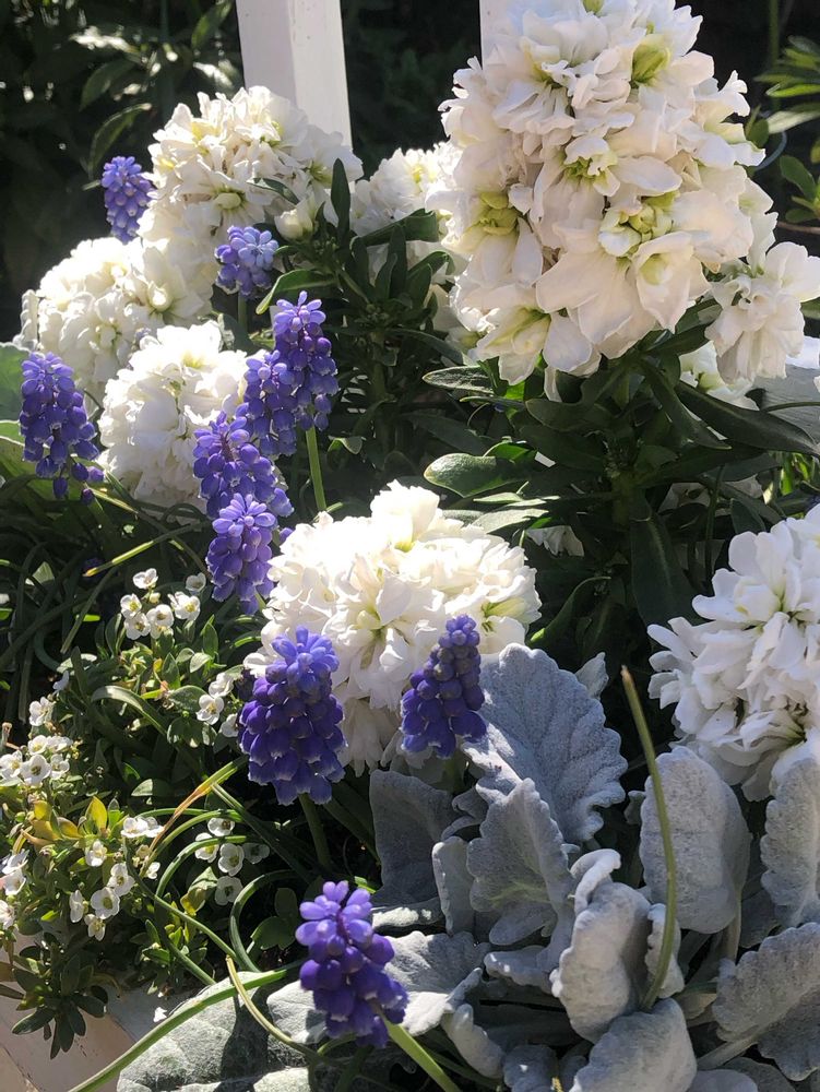 八重咲きストック、シロタエギク、アリッサム 、ムスカリ 良い感じに咲いています🥰