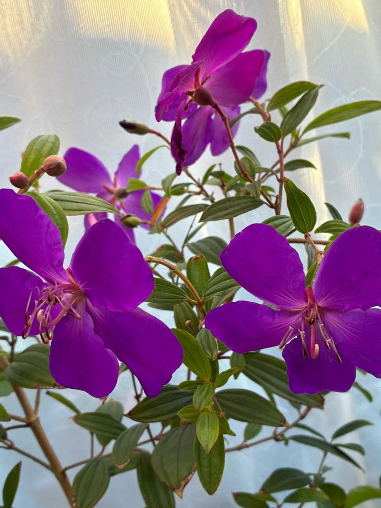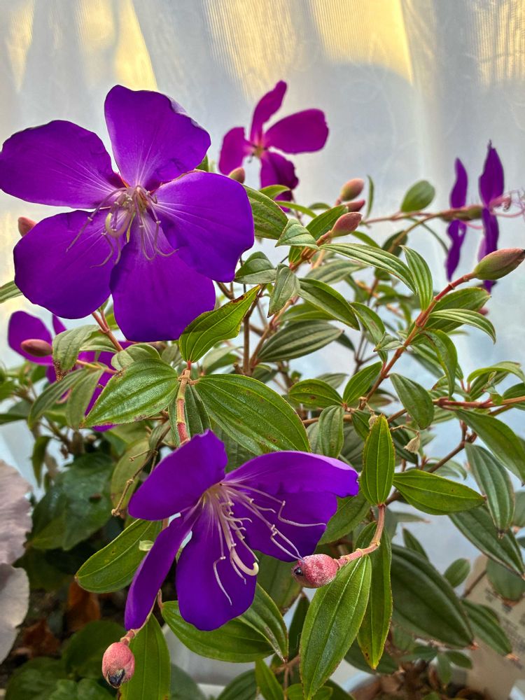 冬越しのため室内に入れて、つぼみがたくさん付いていたのが、次々にヒラヒラと咲いて、20輪以上咲きました💜🌿