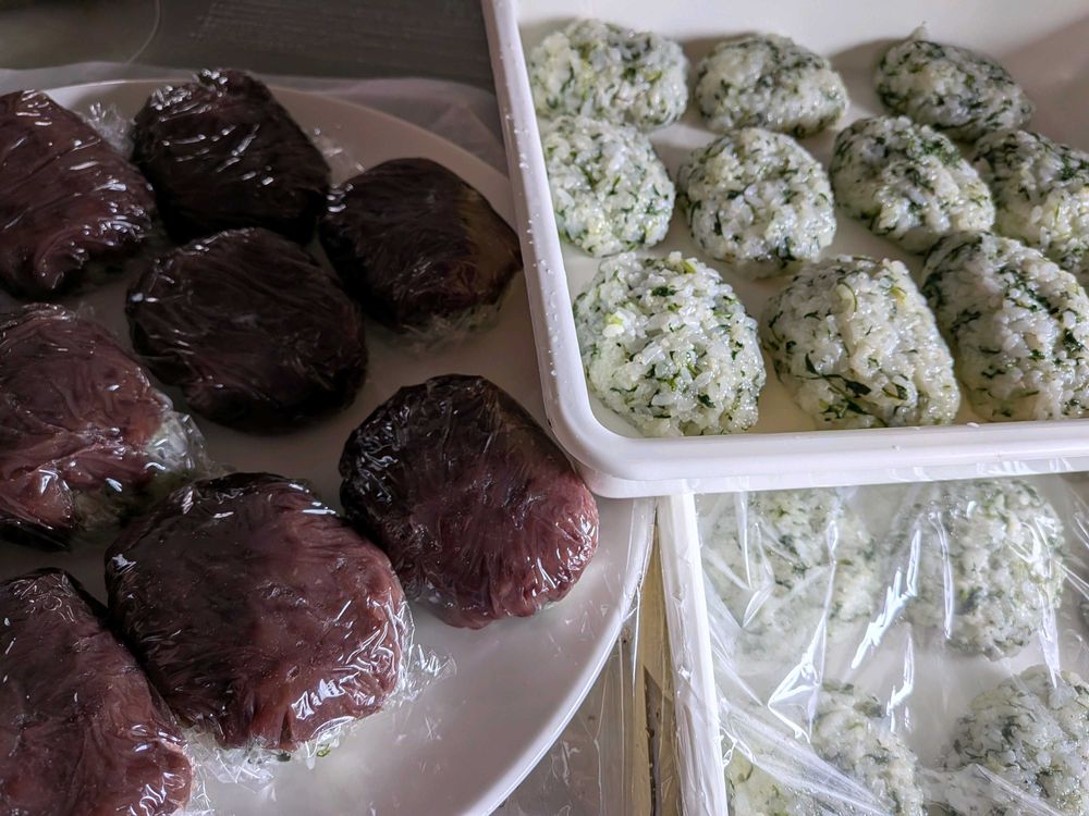 3️⃣昼前に 百歳体操から帰宅して真っ先に取り掛かり餅米9号炊きあがる前に茹でて…何とかヨモギのぼた餅46個できました ·͜·👌 ̖́-
