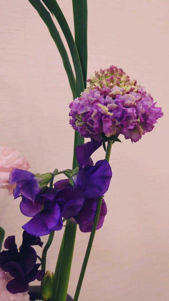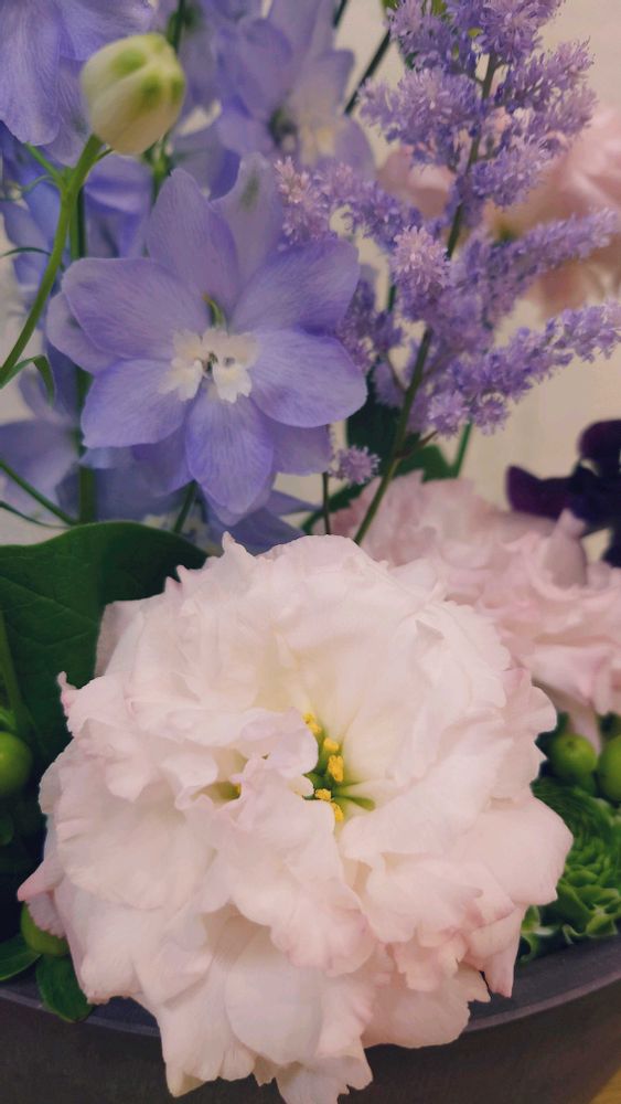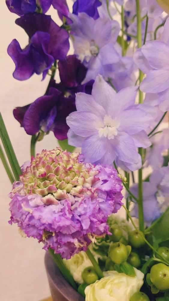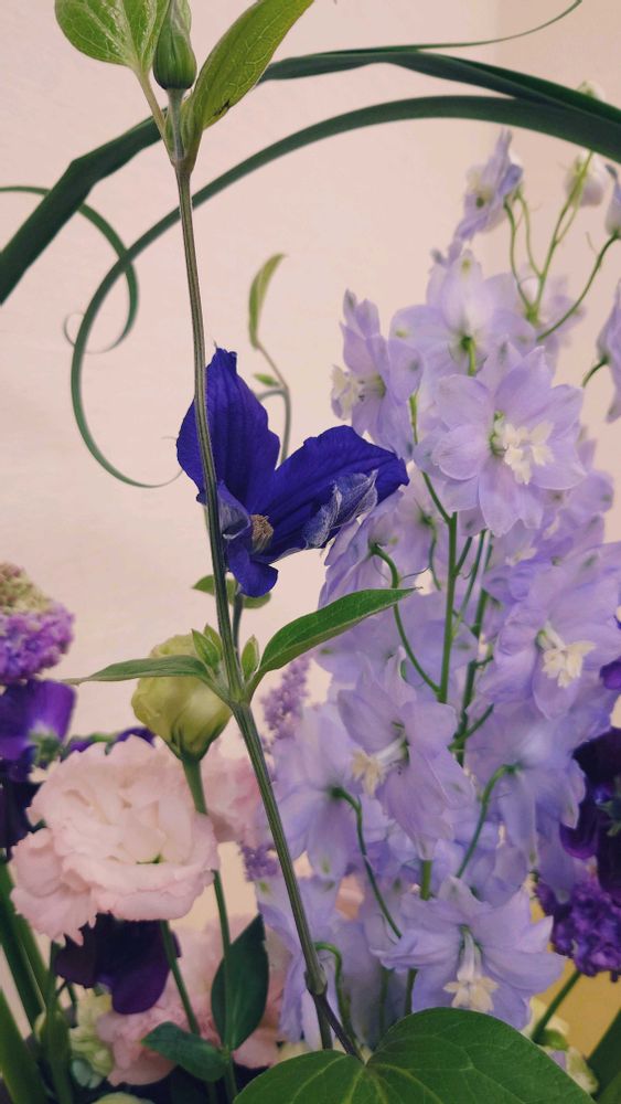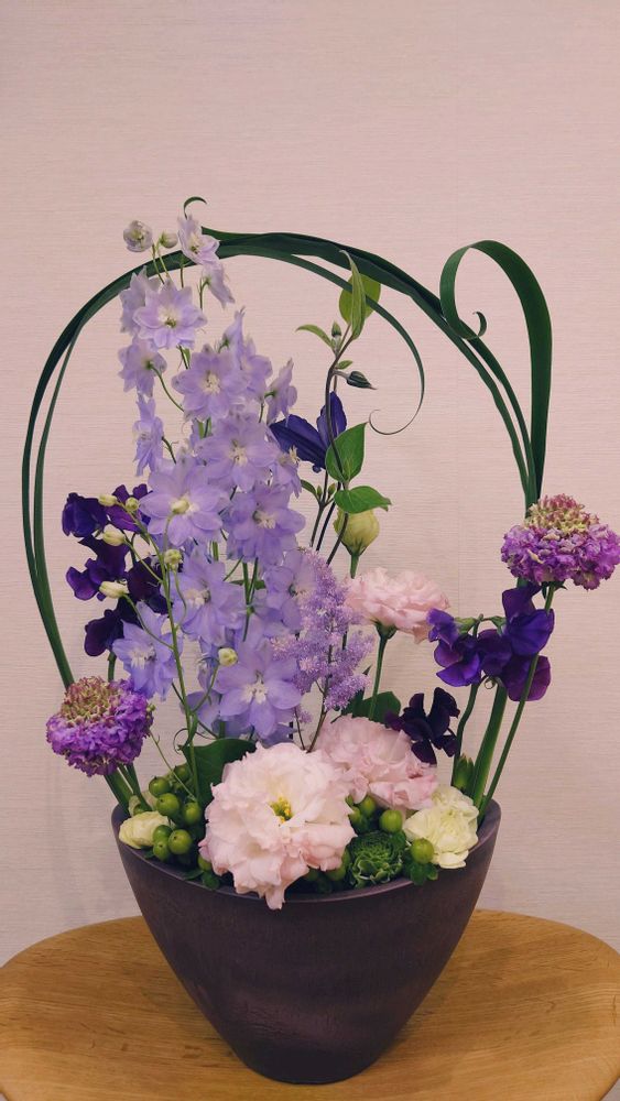 さて、今週のお花は紫色です💗華やかですね💕トルコキキョウ好きな花です。クレマチスやデルフィニウムもちょっと変わった感じで素敵✨️