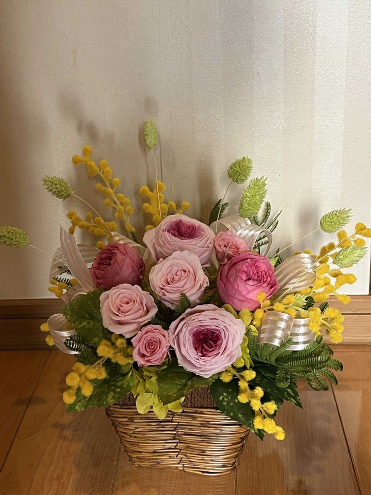 ミモザをあしらった春らしいアレンジで、ピンクの薔薇も入ったので可愛らしく仕上がりました💗
