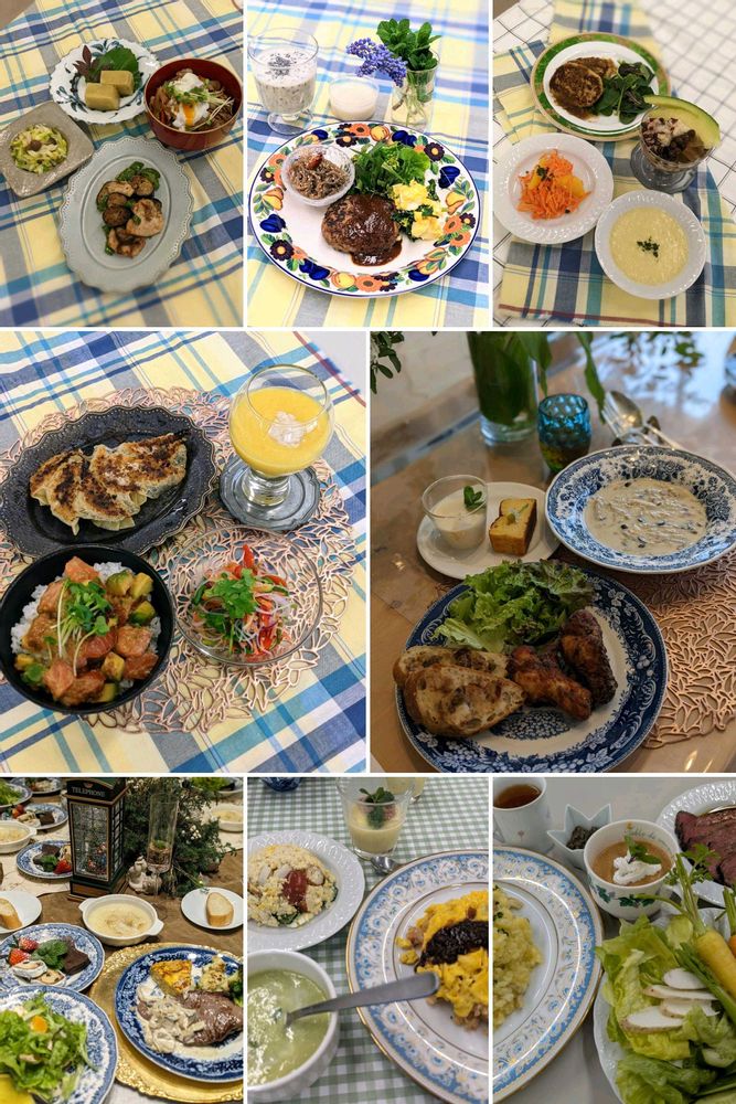 Googleフォトが「似ている写真や動画」と題してコラージュしてくれました🍀😊✨2022年〜2025年🧑🍳お料理教室にお花が飾っていました~♬♬ハーブ教室🌿自家製のお野菜🥕ψ(´ڡ`♡) オイシー♪