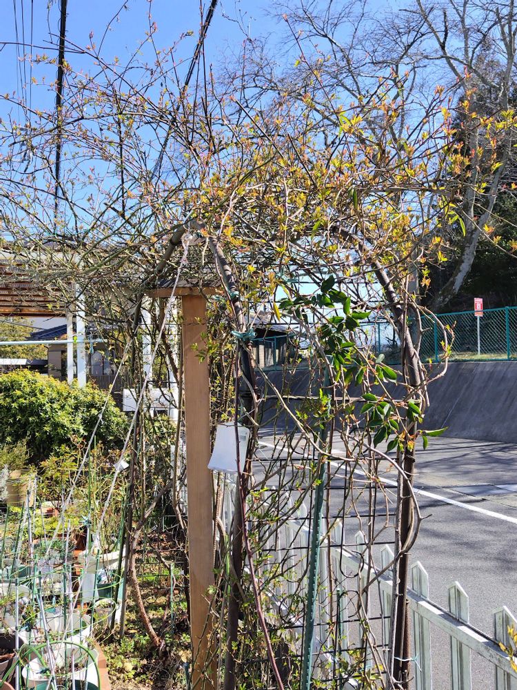 つるバラとモッコウバラの蔓を誘引し、つっかい棒を立て紐でも引っ張って何とか持ちこたえています😂