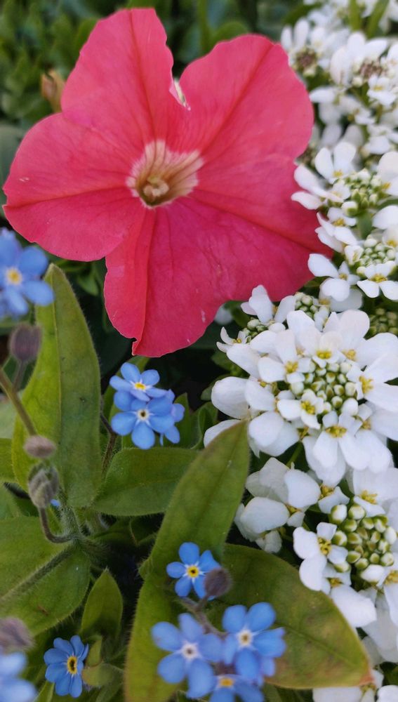 イベリスと勿忘草、清楚で素敵な組み合わせですね♡そこへサフィニアさんの温かい色が加わってポイントになって素敵です💓