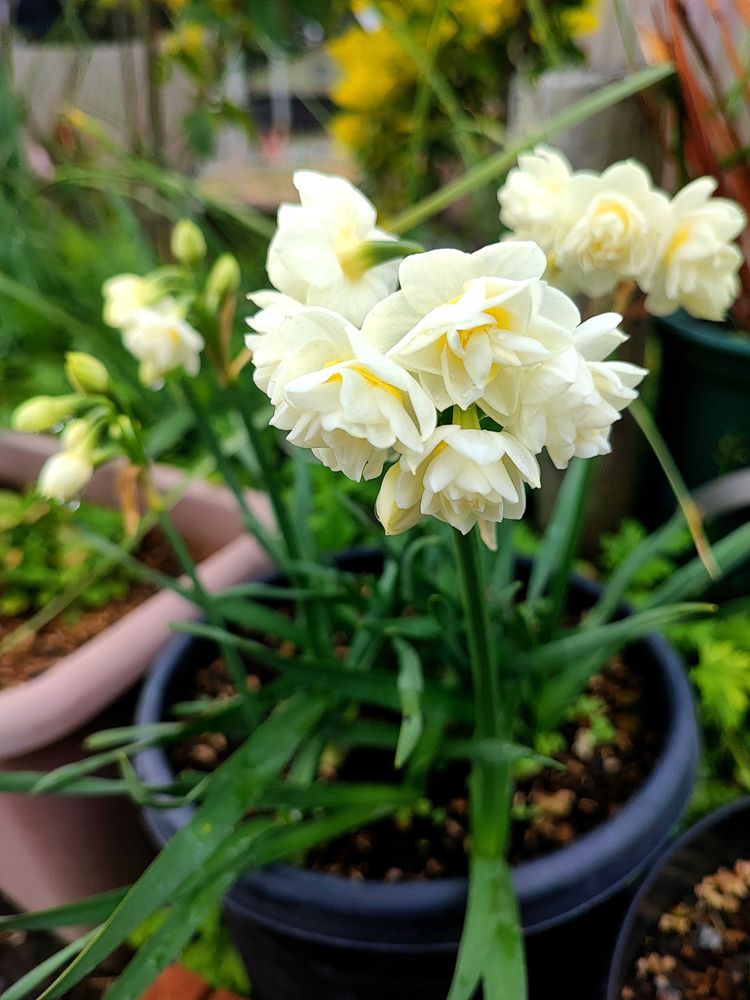 写真は去年の売れ残りを植えていた鉢植えの水仙 エルリッチャー、満開は少し過ぎたけどまだまだたくさん花が咲いている 実もも さくひめ、満開になってきた矮性 実もも みきドワーフ&黄色以外の3年目のラナンキュラス ラックス達、芽出しと共に蕾も確認できたとっても優秀な芍薬ズ、です。