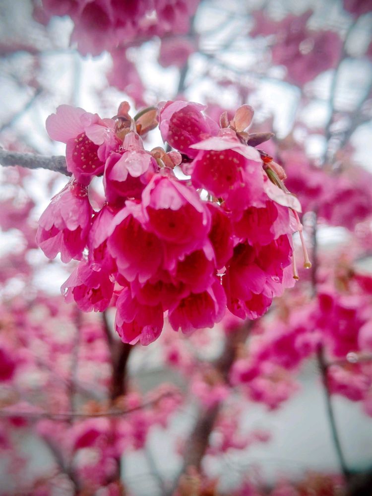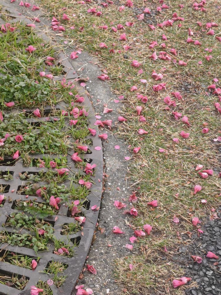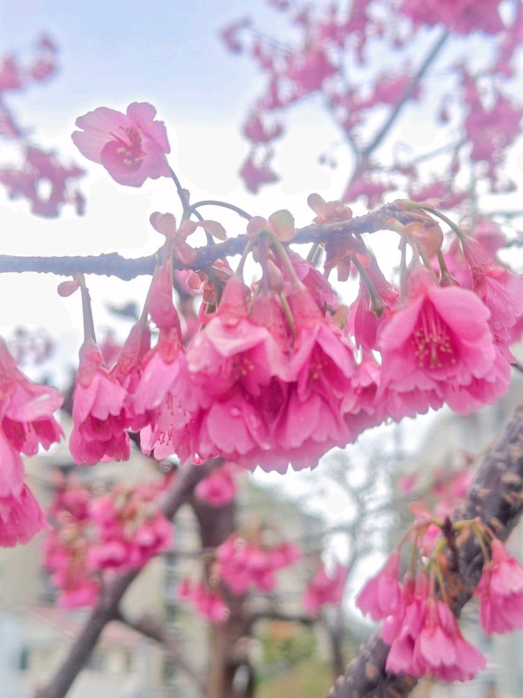 昨日の雨上がりの散歩。寒緋桜🌸も満開でした。雨の滴💧をまとい、うつ向いて咲く花。足元には釣り鐘状の花が、そのままポトッと落ちてました。