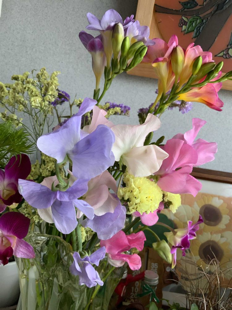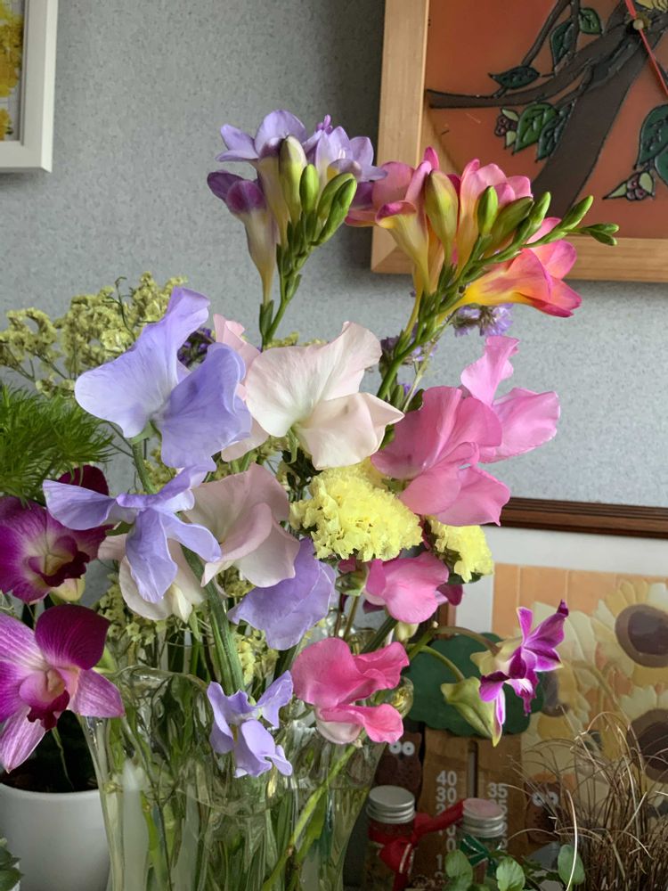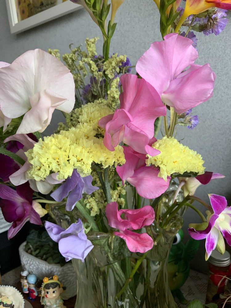 今日の2枚目は切り花のスイトピーたちですo(^▽^)o🩵💜🩷🧡💚
