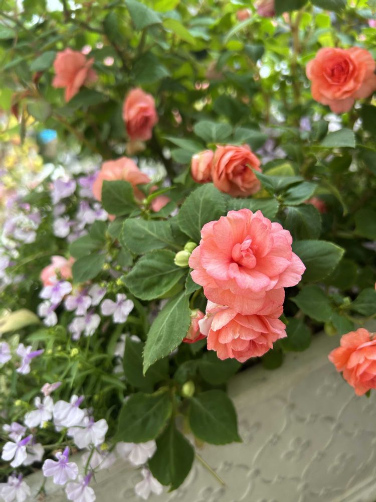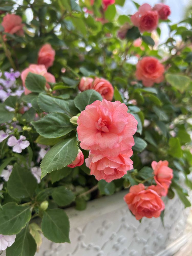 インパイェンスは、日なた~半日陰で管理できますが、鉢の表のお花より裏側の半日陰に咲くお花が元気で優しい色合い🌸🌸🌸
