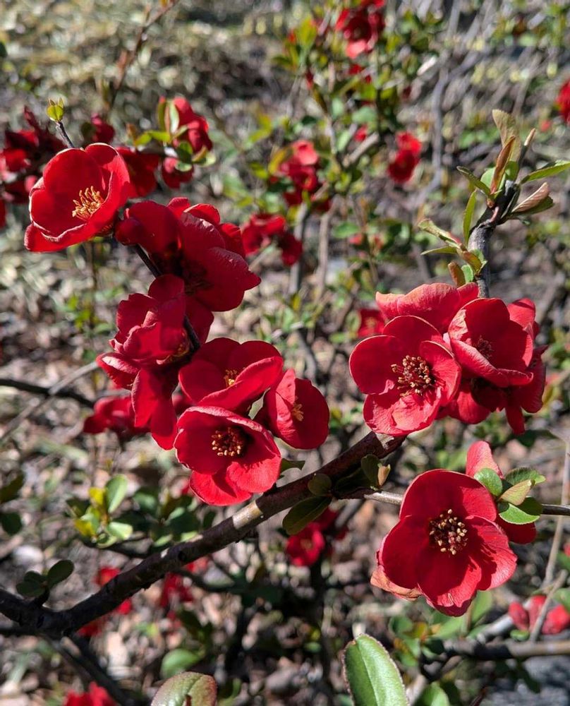 バラ科ボケ属の落葉低木。平安時代初期に中国から渡来したといわれ、薬用植物として栽培されていた。古くから庭木として観賞用に植栽される。江戸時代以降に品種改良が進み現在200を越える品種が栽培される。一輪の花に複数の色が入る『咲き分け品種』、日光によって花の色が変わる『色変化品種』などがある。高さが1m以下の日本固有種の草木瓜(クサボケ)もある。花期は3~4月。葉が出る前に枝いっぱいに花をつける。花は直径2~5㎝の5弁花で花色は豊富。へら形の葉が束状につき、短い枝に刺があるのが特徴。夏に10㎝ほどの楕円形の果実が熟し、果実酒として利用され疲労回復に効果があるとされる。ボケの果実酒は楊貴妃が飲んでいたという。カリン、ボケ、クサボケではクサボケの果実酒が一番香りと味が良い。