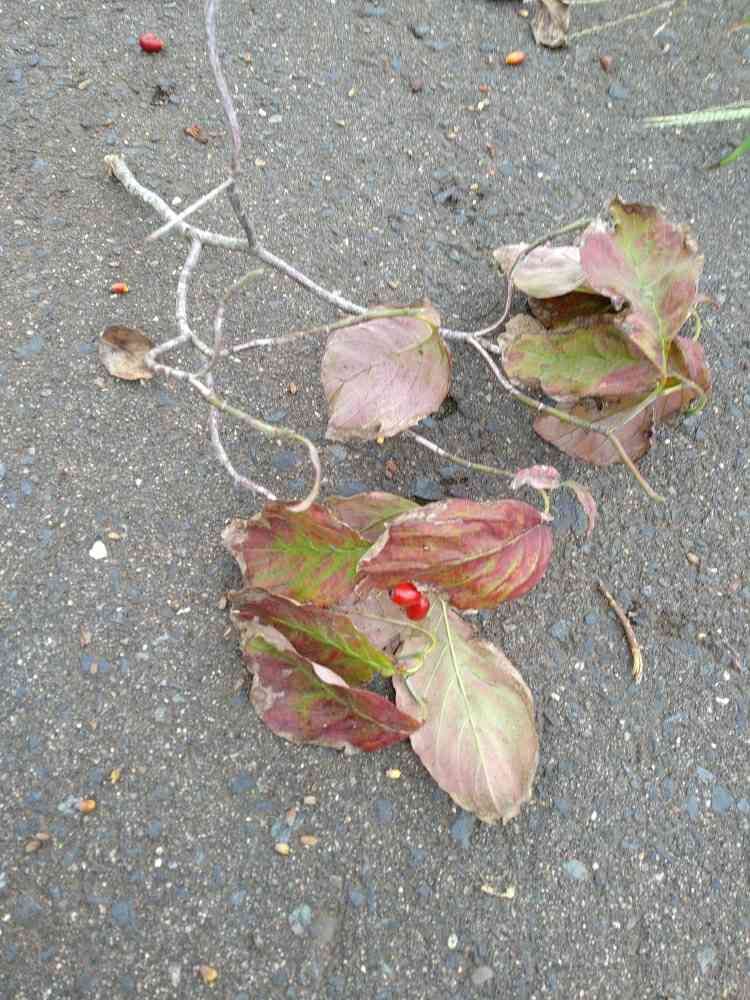 散歩中している途中、ハナミズキの枝が落ちていました。昨日の雨風で折れたのでしょうか?
