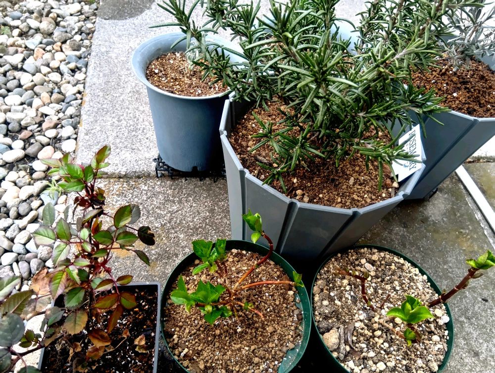 PWさんのラグランジア2つとローズマリー、ミニバラです。もう少し大きく育てたいと思います!