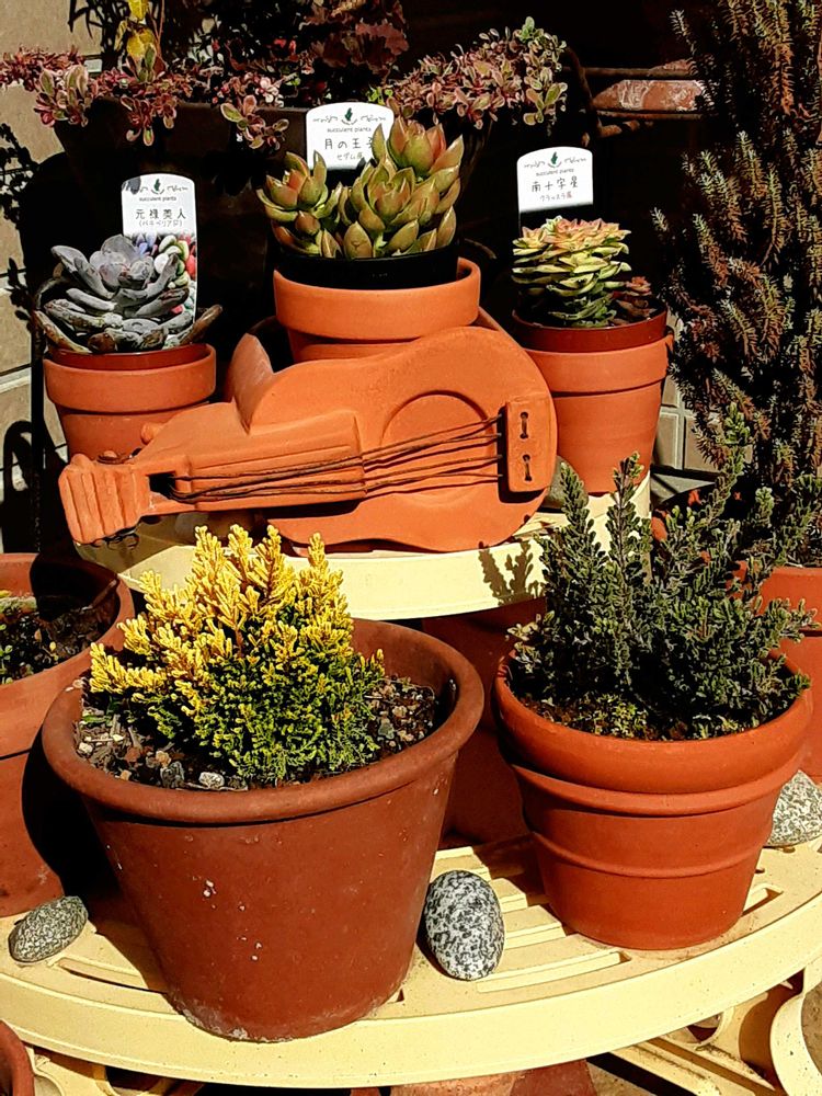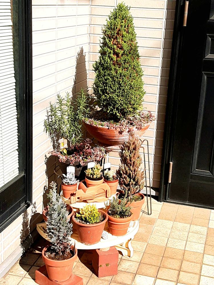 ②ゼラニウム寄せ植えとコニファーは奥からローズダリス、レッドスター、エンパイア