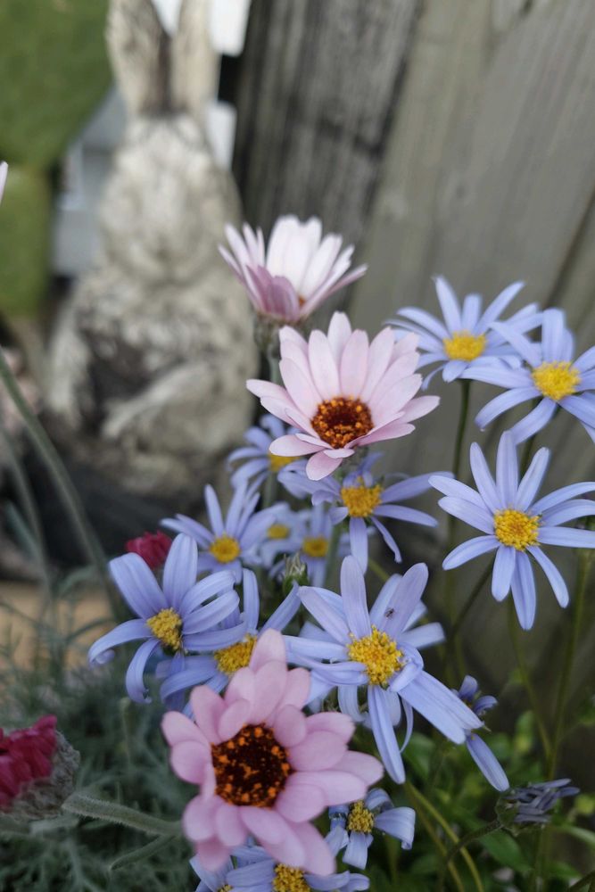 ②玄関アプローチのローダンセマム、ブルーデイジー🌼