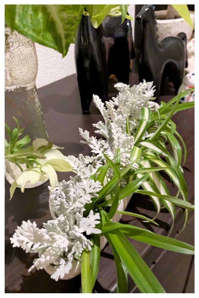 カットして前からあるオリヅルランの中に入れました もうオリヅルランは根っ子が生えています シロタエギクも根っこはえてきたら土に返します そんなことを繰り返し楽しんでいます🌿🌿🌿🌿🌿🌿