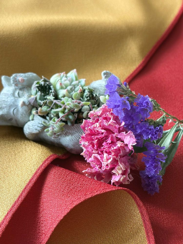 可愛いお花と多肉ちやんを お腹に入れた ネコちやん可愛いよー😺🤩