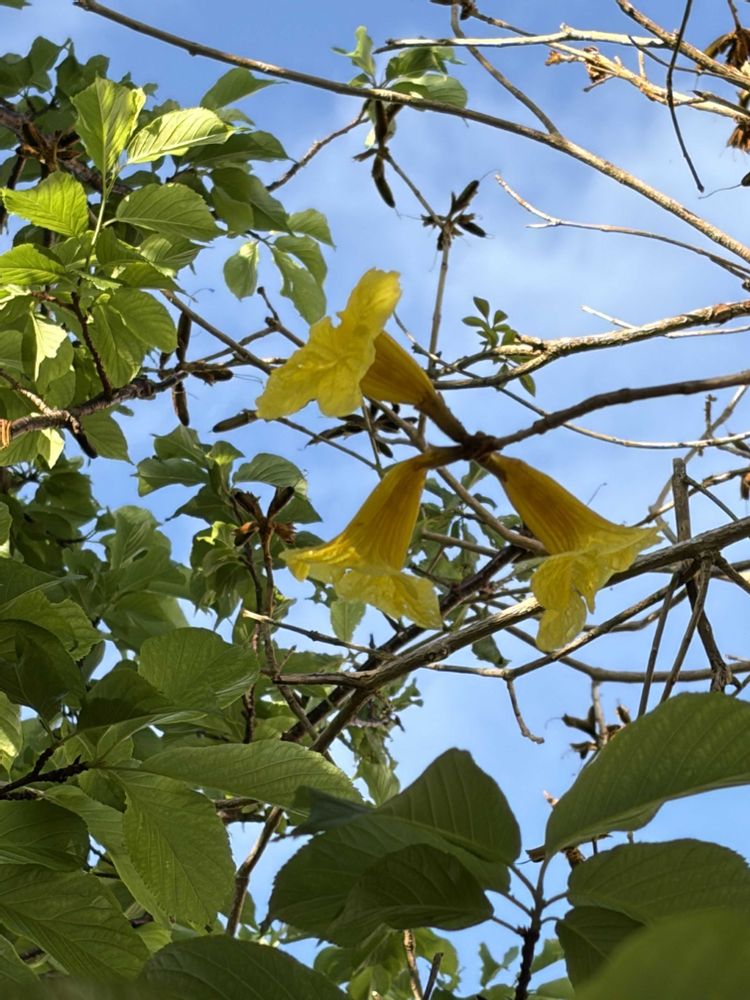 ③イペー最後のひと花🌼3m越えの場所なので拡大してやっと撮れました。周りの若葉は寒緋桜 上のつぶつぶはイペーの鞘の赤ちゃん