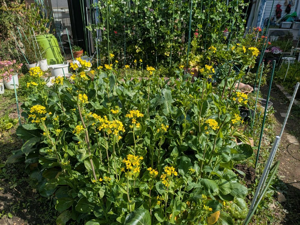 小松菜の蕾の胡麻和え、美味しいです。花が咲いてきてしまって、食べるのが間に合わない。それも良しだね。