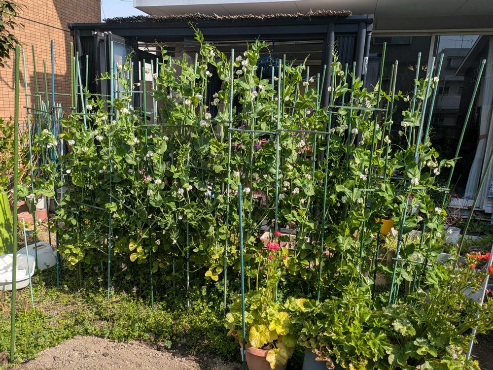 野菜は旦那が担当しています。でも、スナップエンドウは、私がポットに種まきして、ヒヨドリ対策もするから、私の担当ですね。