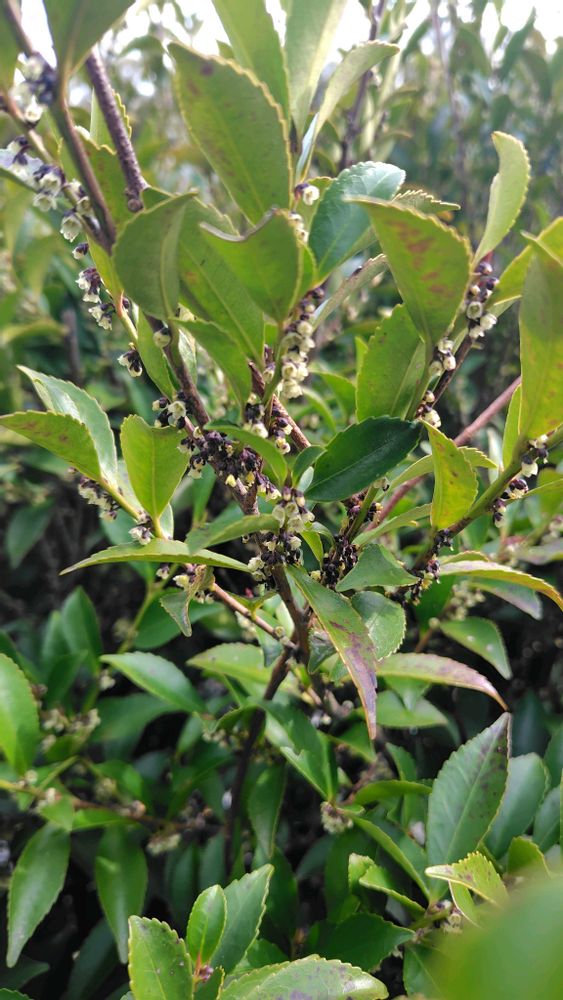 金木犀のような葉に枝に小さな白い花がいっぱい咲いています