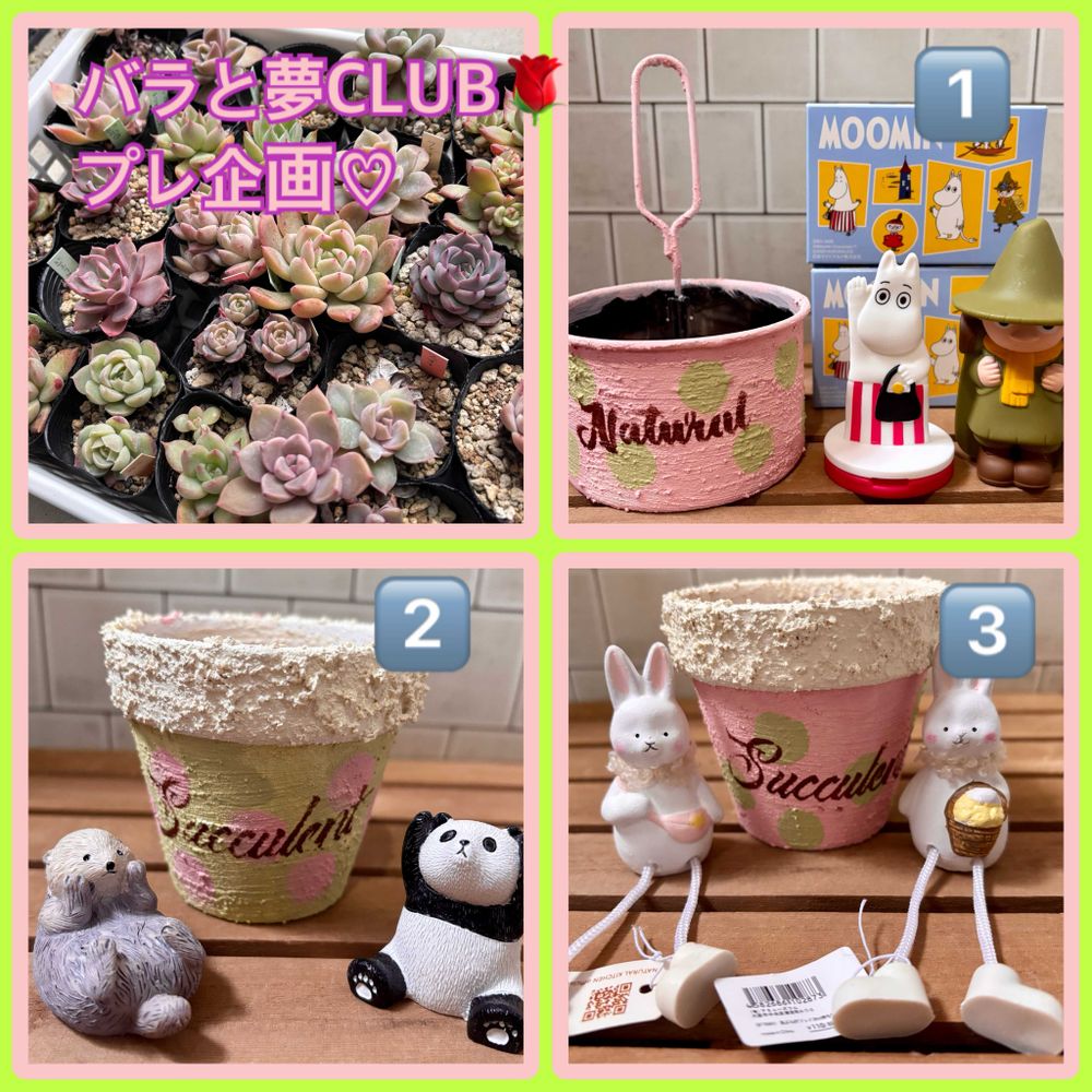 3️⃣リメ鉢(さくら色)、ナチュラルキッチンのうさぎさん2匹🐰、我が家で育った多肉