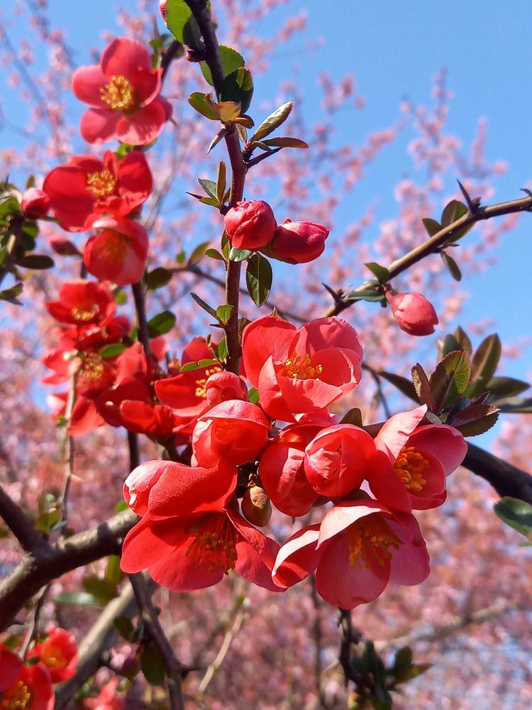 ③真っ赤な木瓜とオカメザクラのコラボ(先週散歩コースで)