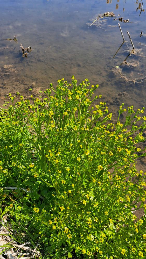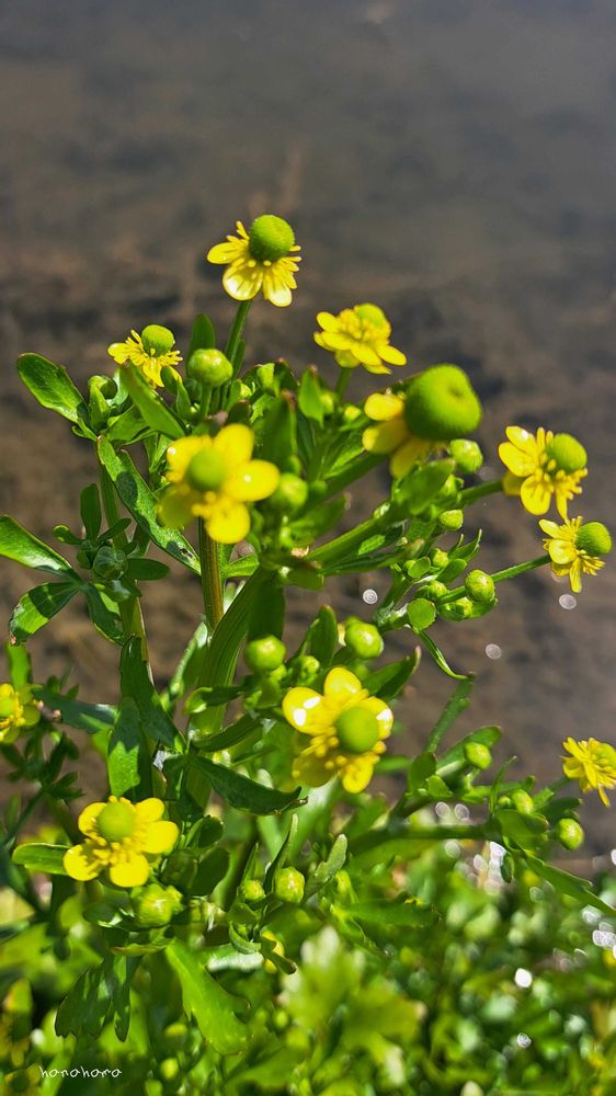花の中心の集合果が坊主頭のようで大きくなり、光沢のある黄色の花が水際でキラキラしています。