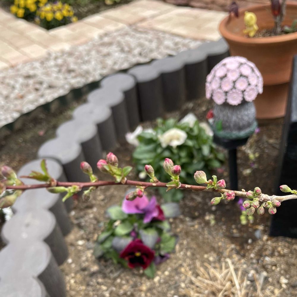 昨日父から庭桜の挿し木をもらって鉢植えに🌸蕾ちゃんびっしり〜楽しみです😆♬