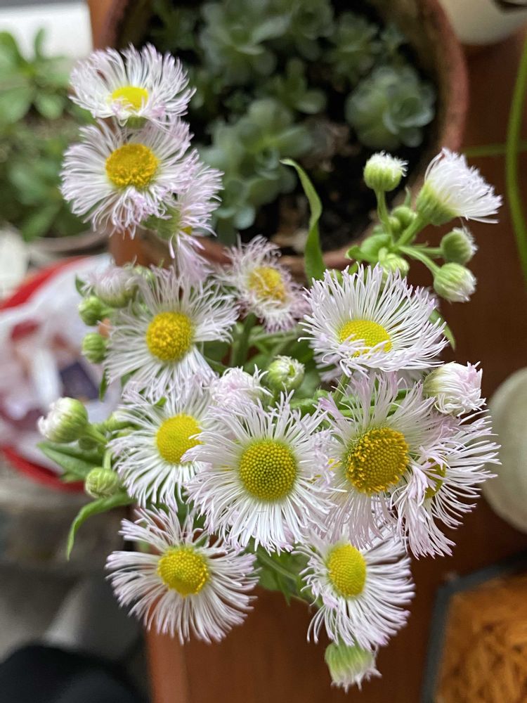 道端の春紫苑を抜いて鉢に植えてみましたが 根がつかず 切り花にしてしまいました 机の上に置いています かわいいですよ 萎れていた小さな蕾も開きはじめました