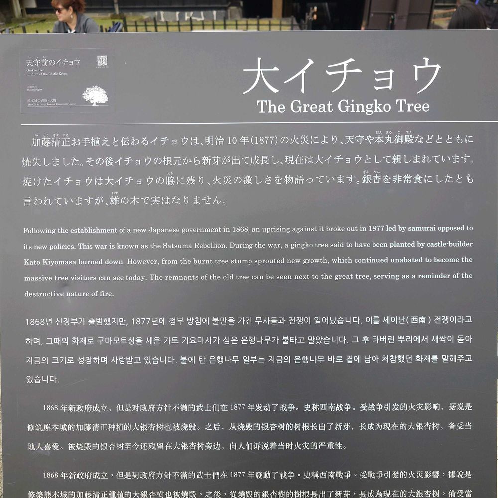 1綱1目1科1属1種で「生きた化石」とも言われ、数億年前からほとんど姿を変えずに生き残っているそうです。写真は熊本城にある大イチョウ。熊本城は銀杏城とも呼ばれるんですって。紅葉、見てみたいものです。