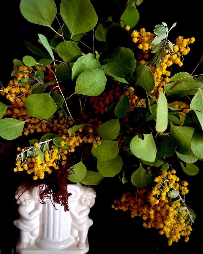 🗒️このミモザの花はドライフラワーにしたもので、下方左側、天使の花瓶のすぐ上に"ケイトウ"の赤茶色のドライフラワーの花をあしらっています。