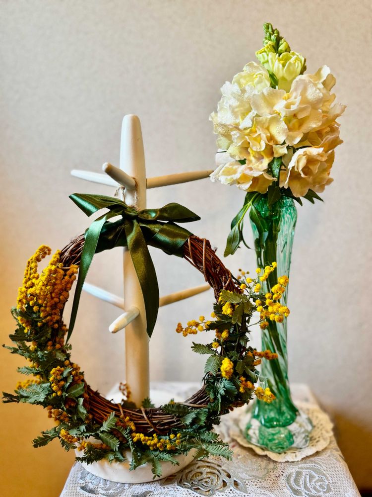 大好きなミモザのリースや🌼春のお花がたくさんのブーケ💐は、楽しいですねー🎶🌼🌸🌿