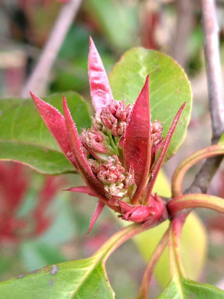 これらの新葉が赤くなるのは葉緑素の形成が進んでいない新葉をアントシアニン色素によって、紫外線から守るためである。