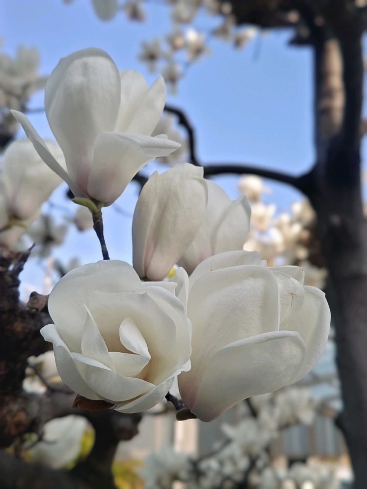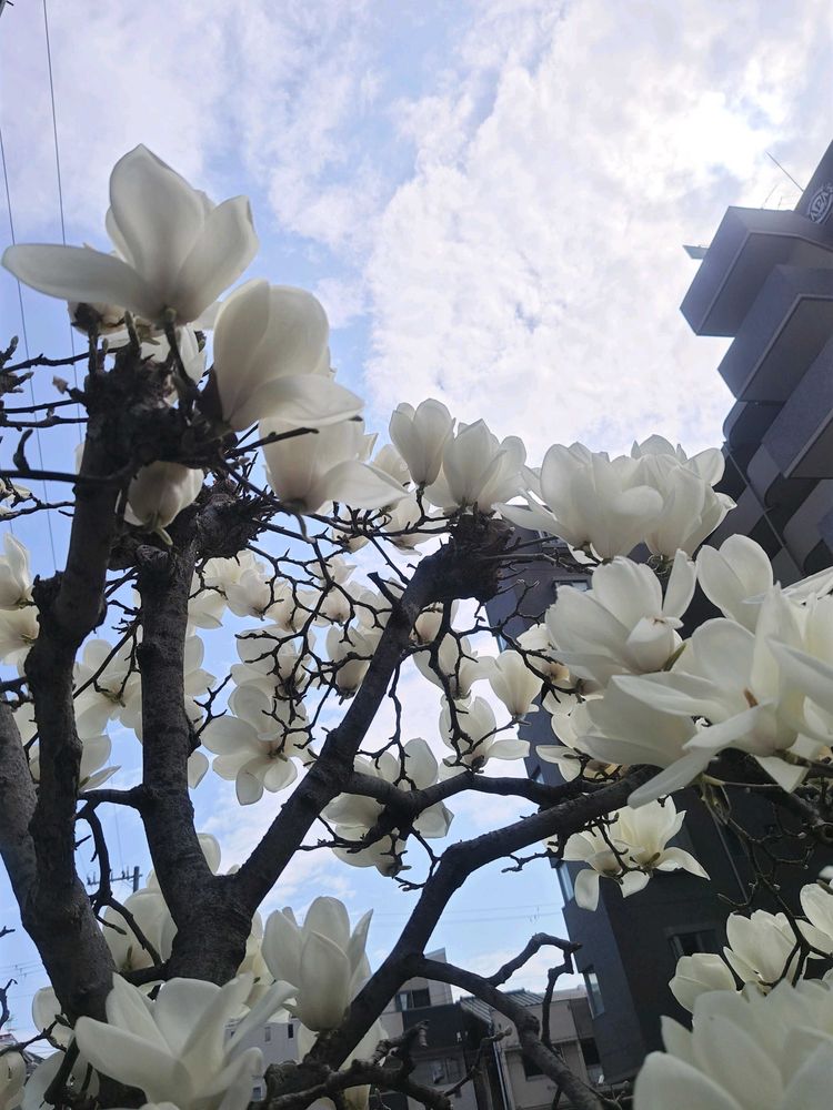 白木蓮が青空の中、満開。