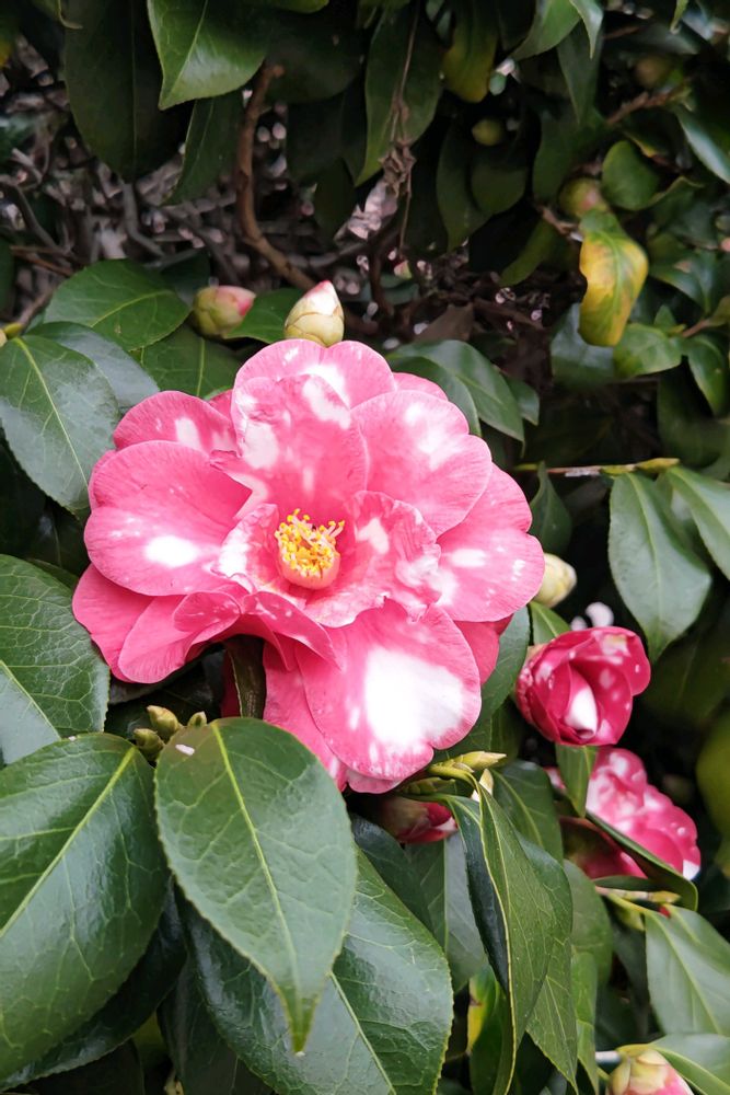 椿バレンタインデー、毎年ホワイトデーの頃に満開になる洋種椿。手のひら程はある大きな花。お散歩ちゃんと記念撮影。