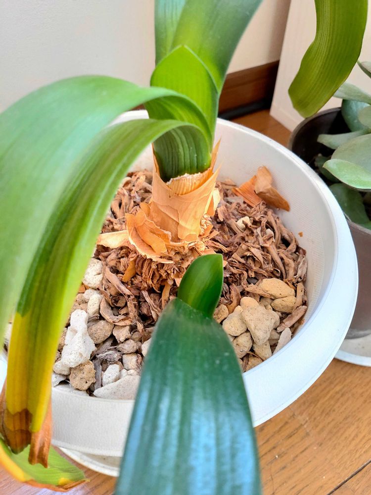 出てきた葉が大きくなった君子蘭と双子みたいにくっついた椎茸