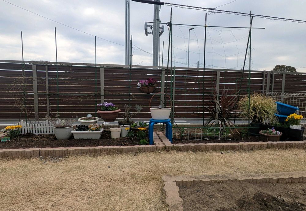 右端に百均のプラ鉢を塗装し重ねて置いてみました😆今のところイチゴとか植えたいなと思っています🍓🍓実は真ん中の花台も子供が使ってた丸椅子を塗装しただけなんです😆