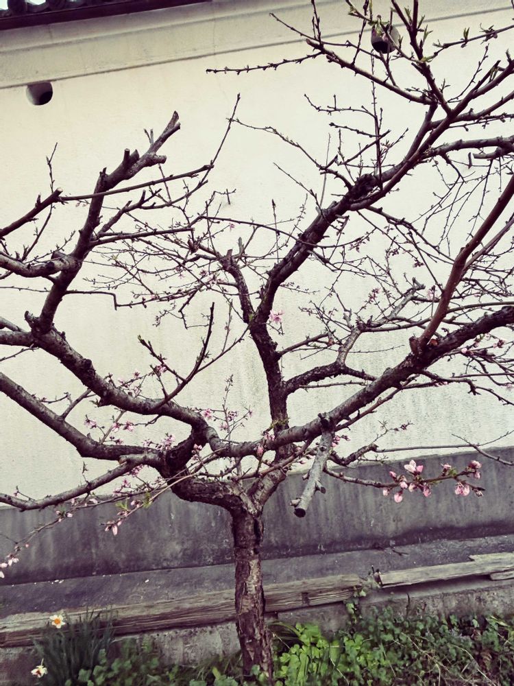 ④駐車場🅿️の奥には桃🍑の木があります。連休前には遠目でツボミあるなって思っていましたが、連休明けに見たらあっという間に咲いていました。