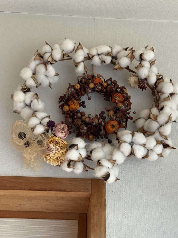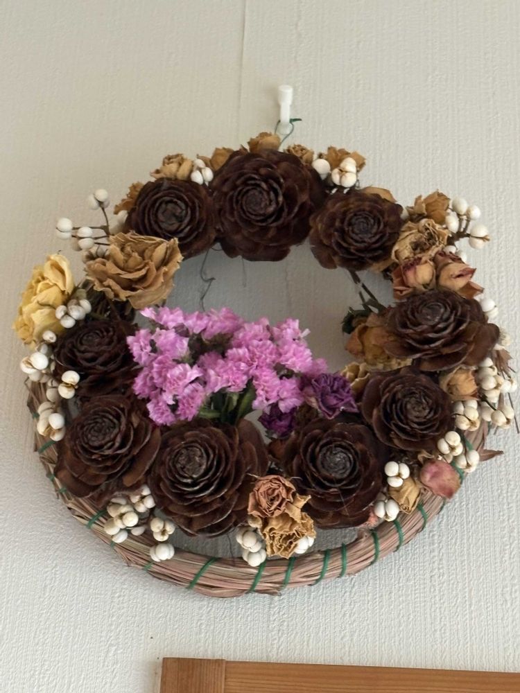 廊下の手作りリースも片付けようかと思いましたが 悩んで邪魔にならない壁の上にフックを取り付けて飾りました