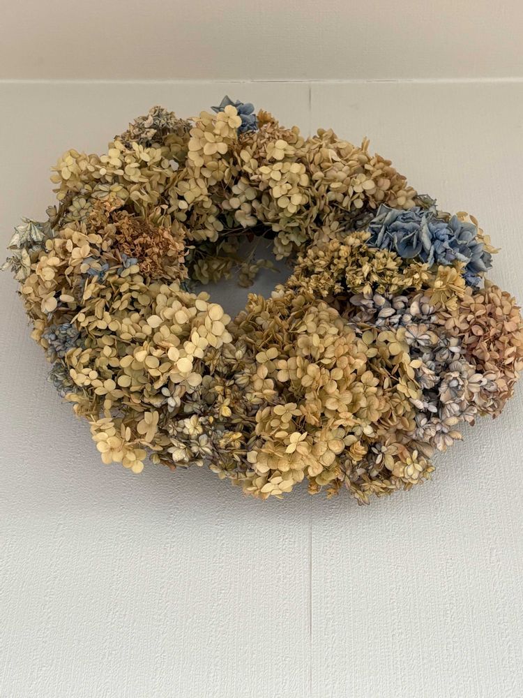 アジサイのリース 最初は丸にキチンとなっていたのに 捨てるのも勿体無くて つい足していき イビツな形にモリモリになりました😅