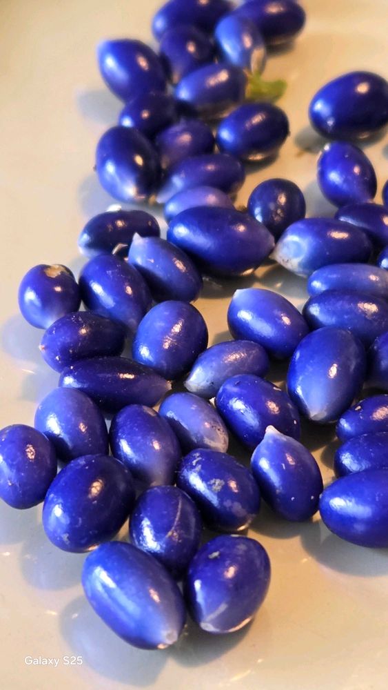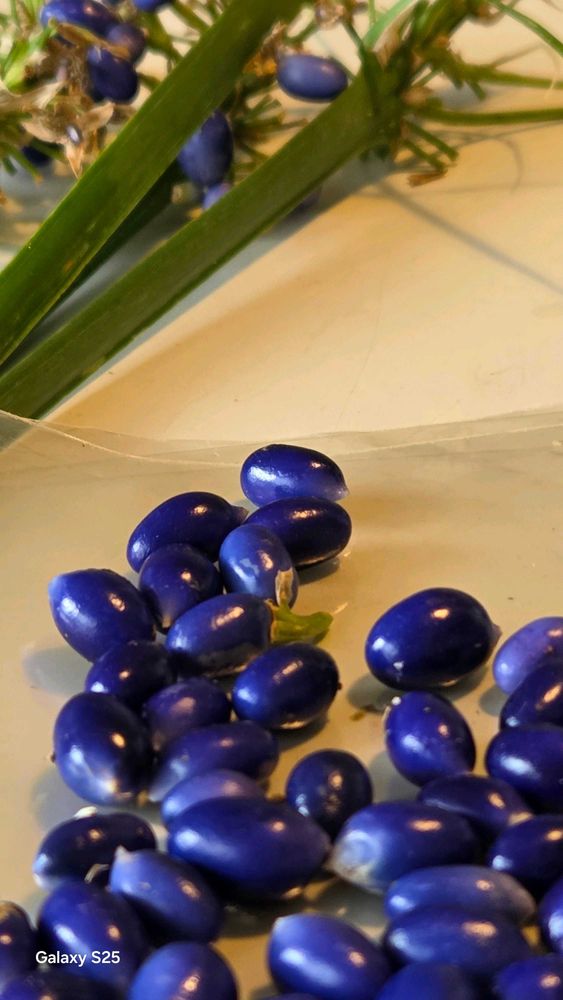 冬を越した実はちょっと傷んで、いつものようなラスピラズリ色にはなっていませんが、こうしてバラバラにしてみると、ブルーのビーズのようです。