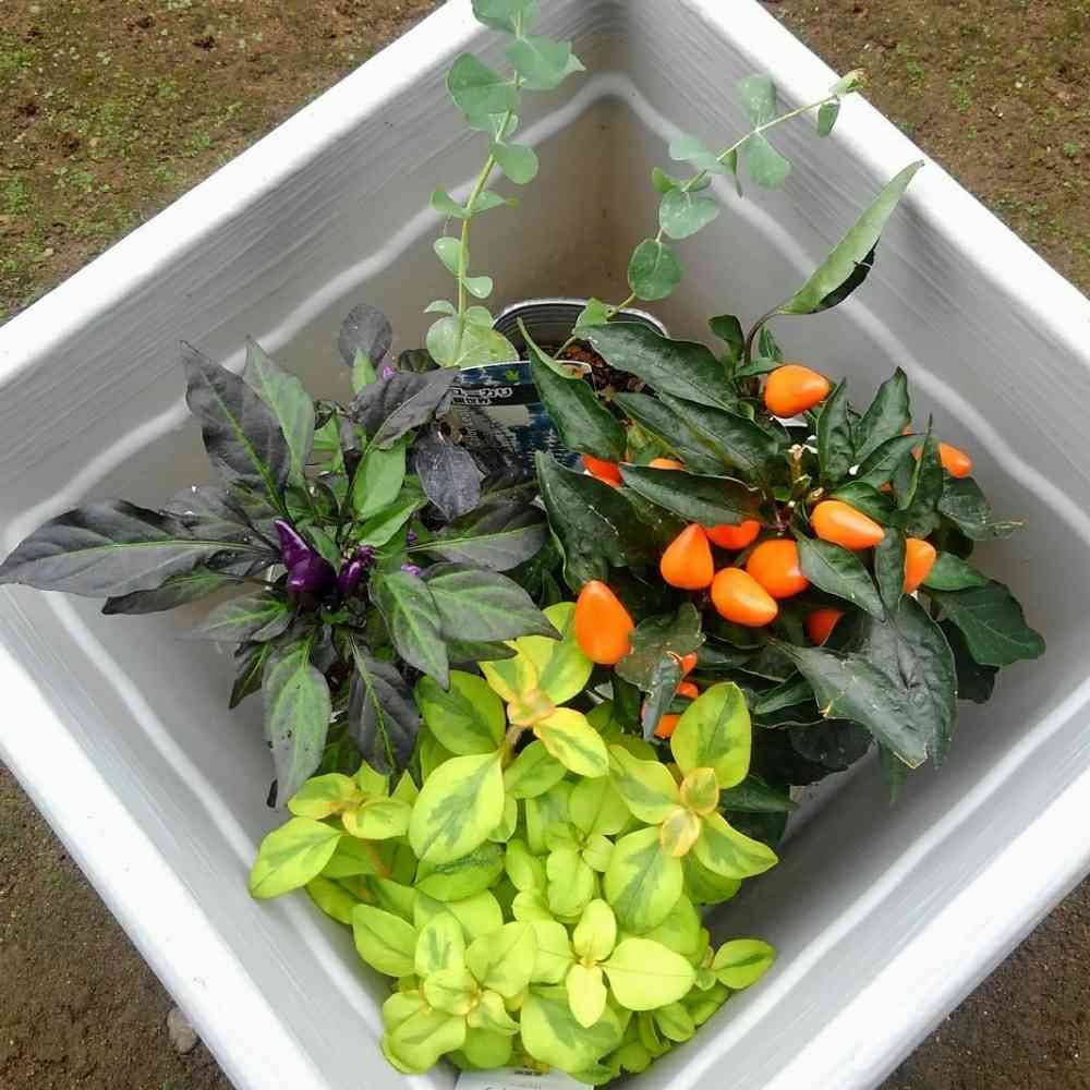 一昨日 仕事帰りにHCで寄せ植えに買ってきた、リシマキアとユーカリと値下げ品で100円だったとうがらしの💜 昨日娘が久しぶりの帰郷でお母さん誕生日だったね🎂って 🌶️オレンジのプレゼントが加わって良い感じになりました😊