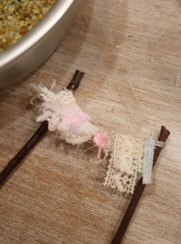 レースやオーガンジーのリボンをカットして、おしゃれな洗濯物に見立てて【洗濯物のゆれる箱庭】を制作✨